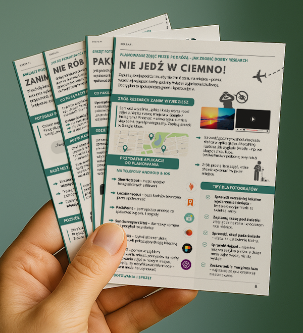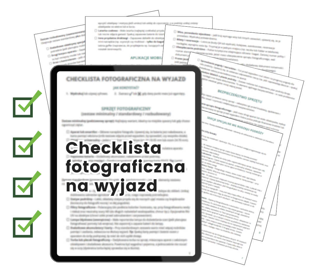 🟢 Gotowe ściągi, checklisty i triki foto, które pomogą Ci wrócić z naprawdę dobrymi zdjęciami.